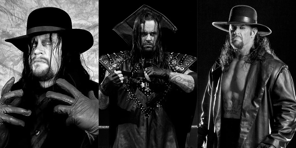 Let me try to compress all his eras into one paragraph: the old Western mortician with a black hat and coat, and grey gloves, the resurrected Deadman with a black hat and coat and purple gloves, the gothic yet humanized Lord of Darkness, the cloaked leader of The Ministry of Darkness, the tobacco-chewing, trash-talking biker called The American Badass, a menacing, short-haired version of the previous incarnation called Big Evil, a hybrid Deadman/American Badass with a black hat, coat and gloves (sometimes switching to other outergarments), and finally, the Unholy Trinity (a fusion of The Deadman, The American Badass, and Mark Calaway himself).