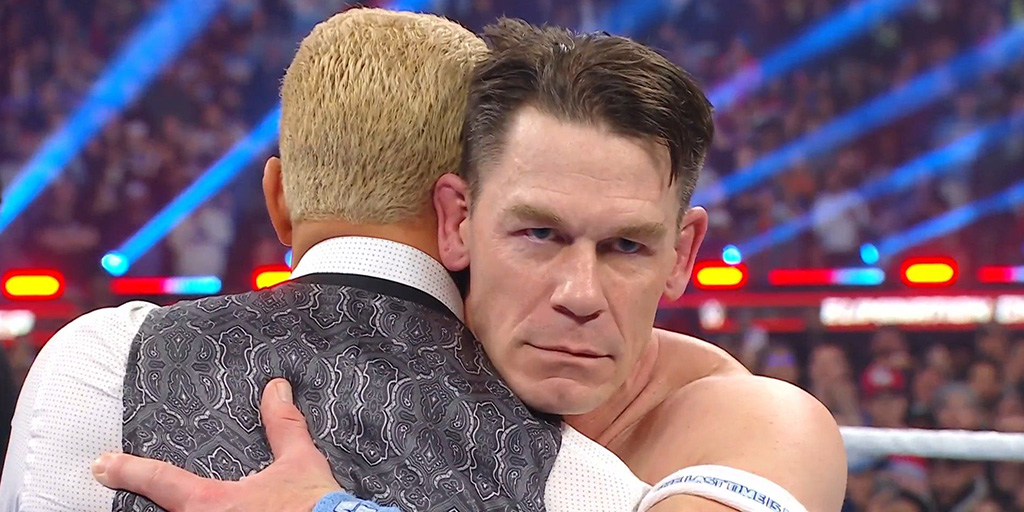 Cena then hit Rhodes with a Rolex, punched him several times, and hit him with a microphone and the WWE title. After that, Cena choked a bloody Rhodes with his tie, Travis Scott punched him as well, and The Rock struck him with a white custom “Cody’s Soul” weight training belt. The Rock then spread Rhodes’s blood into the belt.